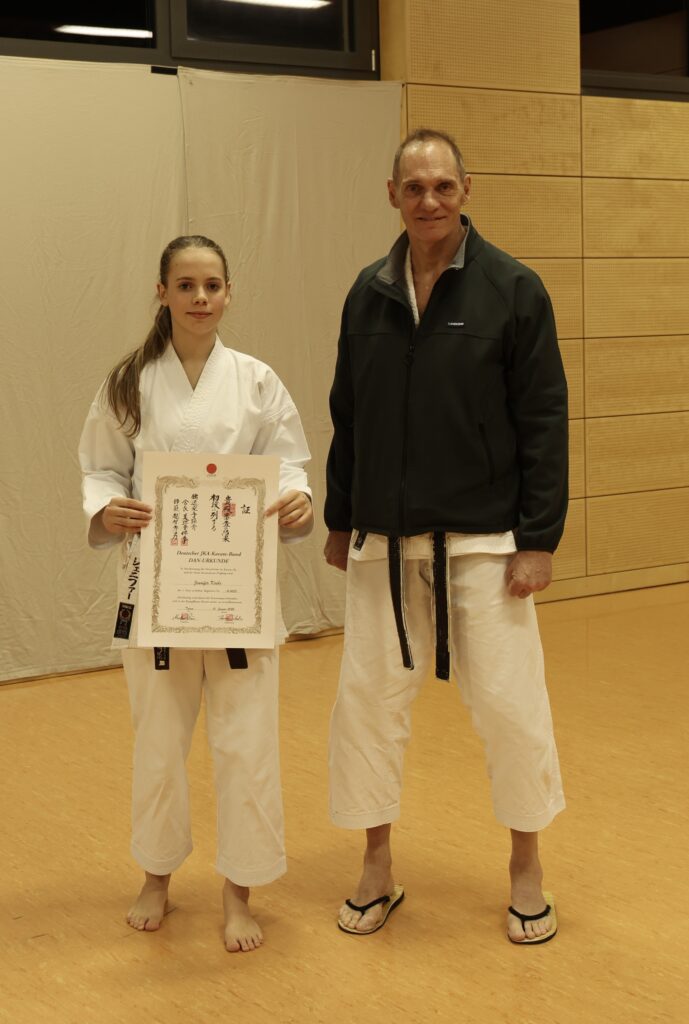 Bereits im März 2025 legte die Gymnasiastin die Schwarzgurtprüfung nach den Richtlinien des Shotokan Cultural Instituts (S.C.I) und des Deutschen Traditionellen Karate Verbandes (DTKV) bei Meister Campari und DTKV-Präsident Manfred Schmoigl in Triftern ab.