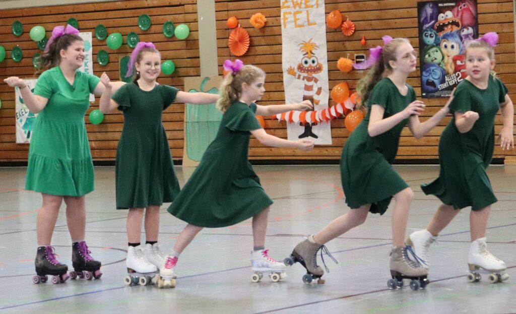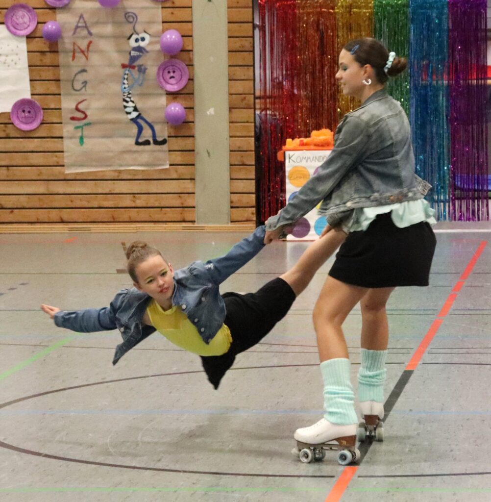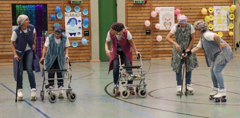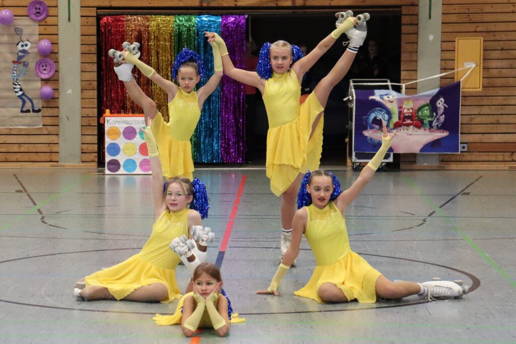 Gut 300 Zuschauer haben in der bis auf den letzten Platz gefüllten Dreifachturnhalle die farbenfrohe Show mit dem Titel „Alles rollt rückwärts“ der Rollkunstlaufsparte der DJK-Sportfreunde Reichenberg verfolgt. Gut 90 Minuten zauberten die 35 Aktiven gruppenweise die Gefühlswelt der Heranwachsenden namens Riley auf die Bühne, zunächst gekonnt dargestellt von Marlene Eiglsperger (11), dann kongenial von Kristina Lehner (15).